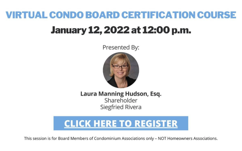 Join Campbell Property Management for this Virtual Condo Board Certification Course taught by Laura Manning from Siegfried Rivera.