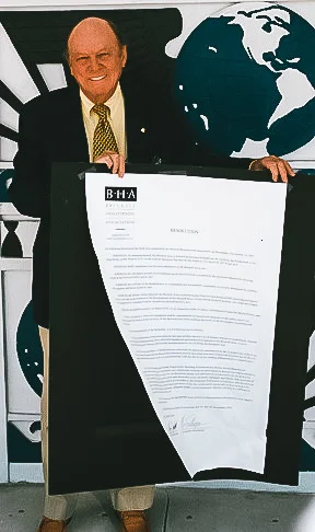 Tory at Miami City Hall in January 2002 presenting a Resolution from BHA calling for restricting contractors from usurping the sidewalks and streets. The construction boom was taking over at the risk of pedestrian safety.